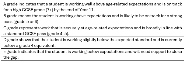 In Years 7 (Key Stage 3), students receive grades from A to E. These grades describe how securely your child is working in relation to the expectations for their age and how this connects to future GCSE outcomes.